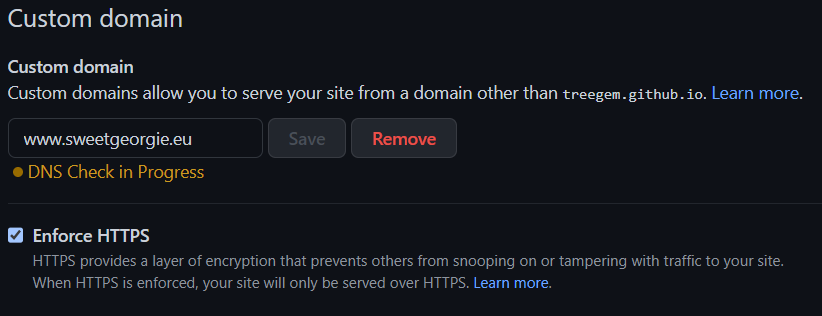 Yeah, that’s right: a custom domain, so that you can pretend professionalism to dorks like me. But again, GitHub Pages is the simple solution. You buy a cheap domain and can use it to display the GitHub Pages content. All that is needed is to enter the custom domain in the repository under Settings -> Pages -> Custom domain:
